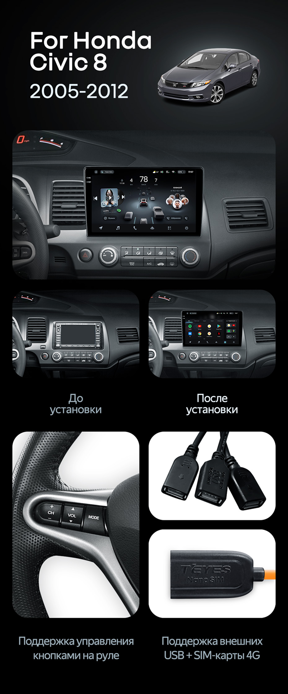 Штатная магнитола Teyes CC4 Pro 12/256 Honda Civic 8 FK FN FD (2005-2012) - купить всего за 73 560 руб. в интернет-магазине в Москве Teyes.com.ru. ✓ Самый лучший выбор мультимедиа ✓ Лучшая замена штатному ГУ ✓ Тел. +7 (800) 775-31-74